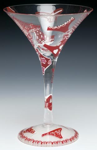 Lolita Red Panties Martini Glass features a design inspired by a delicious martini recipe, which is printed on the bottom of the glass! Each martini glass holds approximately 7 ½ ounces of your favorite martini and each comes distinctively gift boxed. The glasses are hand-painted with food-grade non-toxic paint.